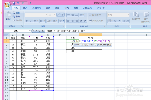 录入=SUMIF(D1:D17,F2,)即乞降前提,以1班作为乞降前提。