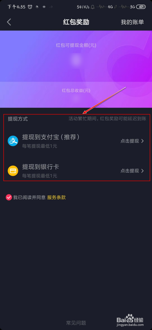 在“红包奖励”中选择“提现体例”点击