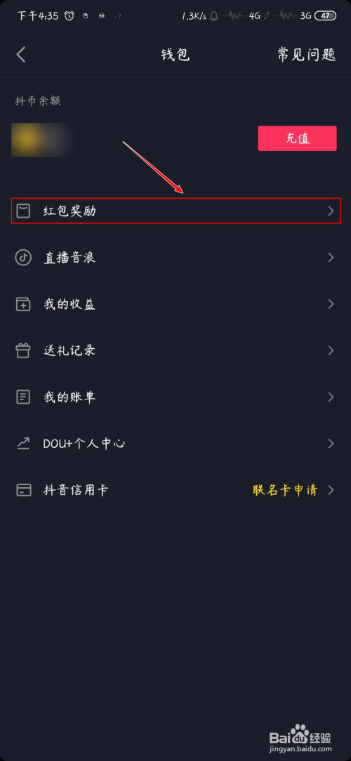 进入“钱包”后,选择“红包奖励”