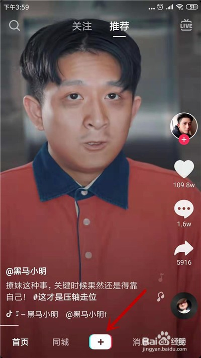 第二步,在抖音本家儿页,点击底部“+”选项。