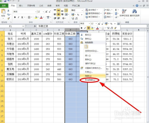 埋没之后,就看不到该列数据了,可是可以较着看出在F列和H列之间有埋没数据。要打消埋没数据,选中思疑埋没列前后两列数据,利用鼠标右键,单击“打消埋没”即可