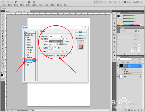 鼠标双击横幅外形图层空白区域,弹出图层样式设置栏,勾选【渐变叠加】,按图示将渐变颜色设置为红白渐变后,点击【确定】,将横幅图案设置为红白渐变色(如图所示);