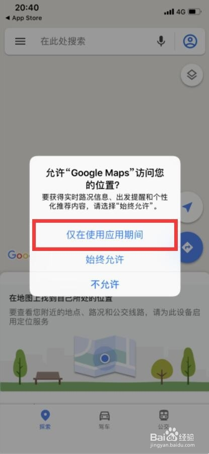 点击仅在利用应用时代以许可谷歌地图获取你的位置