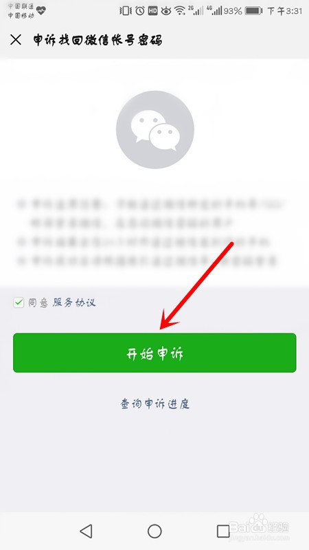 2、点击申诉找回微信账号密码,赞成办事和谈,点击起头申诉。