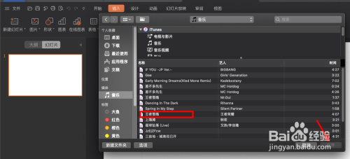 点击插入音频后,会弹出一个选择文件界面。点击你想要插入的音乐,然后点击“打开”即可。