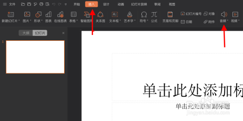 打开电脑上的WPS Office。新建一个PPT文档。点击菜单栏中的“插入”栏目然后点击“音频”。