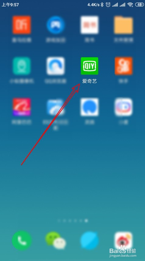 解锁手机屏幕后,在桌面上摆布的滑动,找到安装好的“爱奇艺”的图标。