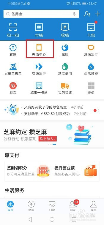 第一步在我们的手机上打开支付宝,进去首页之后,点击充值中间,如下图所示: