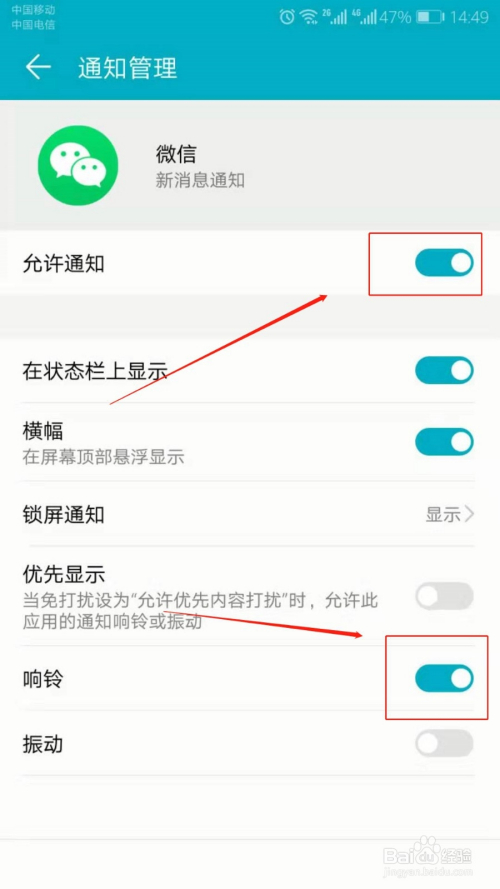 将许可通知和响铃后的开关点击为开启状况,即可完当作操作。