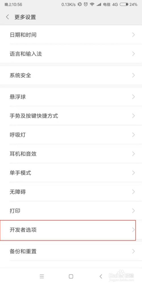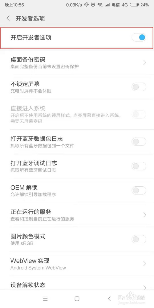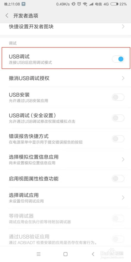打开“开辟者选项”,找到下面的“USB调试”,并将开关打开,这样就打开了小米手机的调试