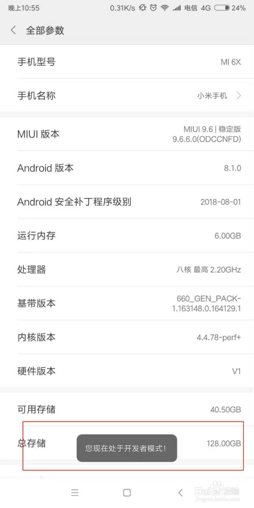 持续多次点击“MIUI版本”这个菜单,直到呈现“您此刻处于开辟者模式!”