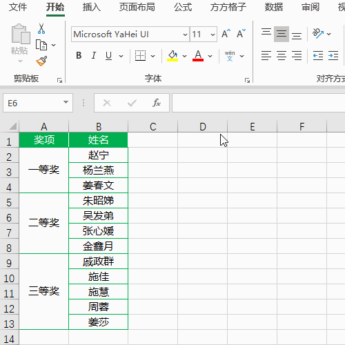 如下图是某公司某次角逐获奖名单,此刻想将各奖项后面的员工姓名归并在统一单位格中显示。