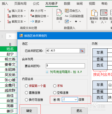 勾选【用-毗连】,并将方框内容选择为逗号。然后点击【确定】。