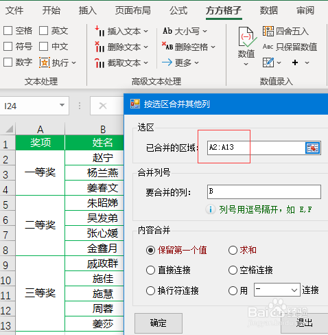 在【已归并的区域】选项中输入A2:A13