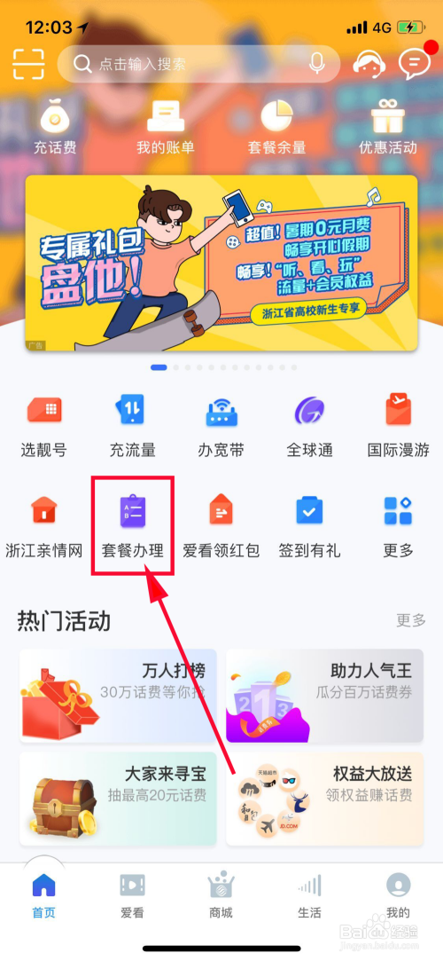 在手机营业厅首页界面中,我们点击【套餐打点】,进入套餐打点界面。