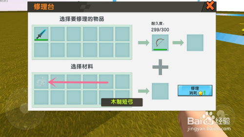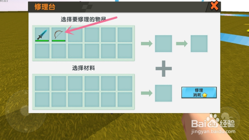 放入兵器后,在材料区域里点击材料将它放入补缀台上。好比弓需要的材料是丝线,点击丝线图案就可以放入补缀台。