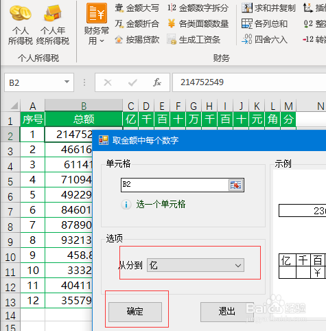 在【从分到】选项中选择亿,然后点击【确定】(ps:若是你的栏目不到亿,可以选择其他选项)