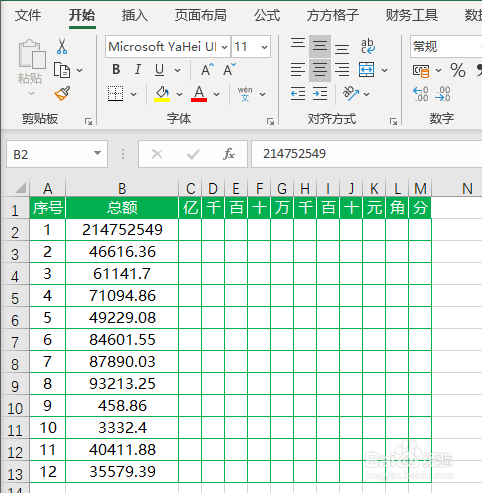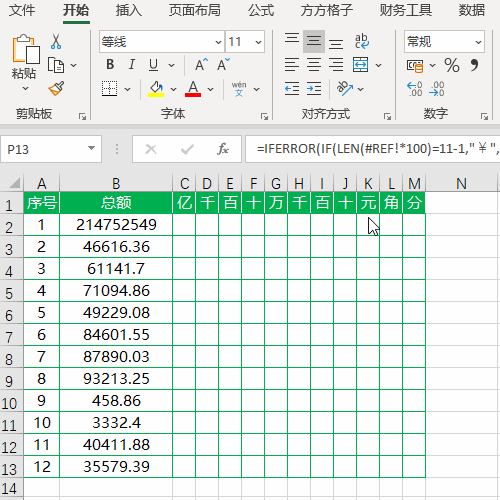 如下图,B列是总金额,此刻想要将B列的数值,拆分到右侧对应的个十百万万……亿单位格中。