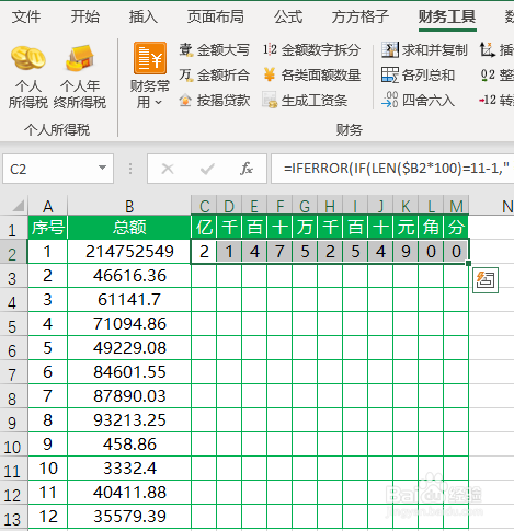 将C2:M2区域公式标的目的下填充,即可完当作所有金额拆分