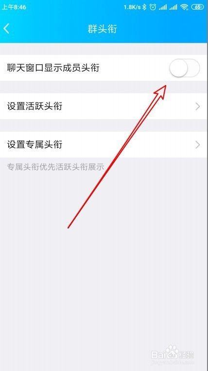 点击该设置项后面的开关,把其设置为封闭的状况就可以了。这样在QQ群里就不会再显示出群头衔的名称了。