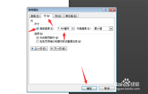 然后弹出来的表格属性窗口,在行中勾选指定高度,数值输入7.42,点击【确定】,如图所示。