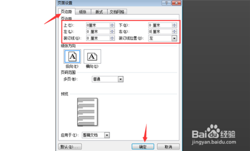 然后弹出来页面设置窗口,在页边距中,将上下摆布调当作0,点击【确定】,如图所示。