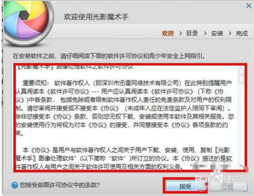 双击软件图标就会跳出安装界面,这里会显示一些软件利用和谈,有乐趣的伴侣可以细心阅读,即即是你分歧意条条目也必需选择接管,不然软件安装将无法进行。