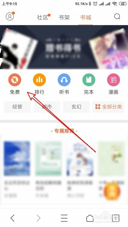 这时就会打开QQ浏览器的书城页面,在页面中点击“免费”的快捷链接。