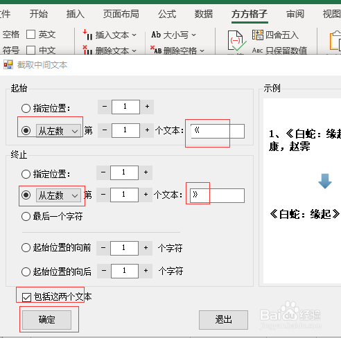 如下图,勾选【从左数】并在后面方框输入“《”。然后在终止选项中勾选【从左数第一个】并输入“》”,接着勾选【包含这个两个文本】,最后点击【确定】即可完当作