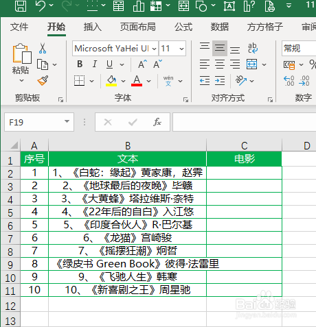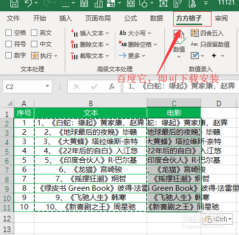 如下图,B列是一些紊乱的数据,此刻我们想要从B列数据中提掏出片子名称放在C列单位格中。