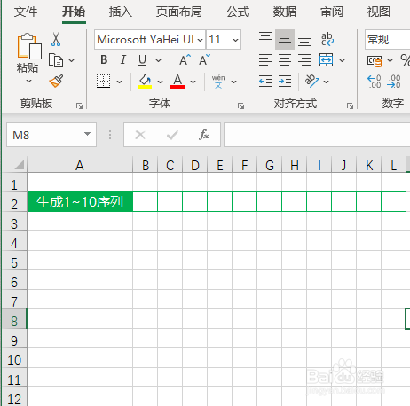 给大师举个例子演示一下函数的用法,如下图筹算在Excel表格第二行生当作数字1~10.