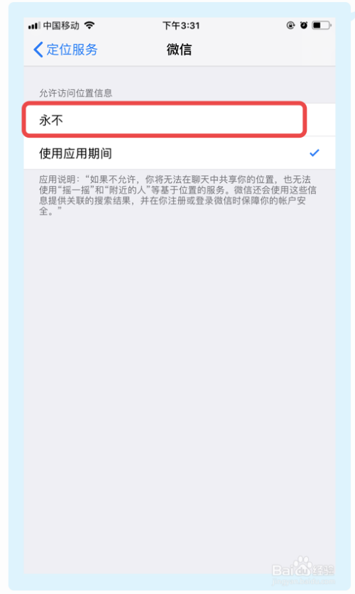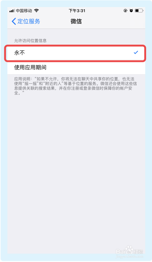 5.在接下来的界面,选择并点击【永不】选项,完当作以上步调即可封闭微信公家号的定位功能。