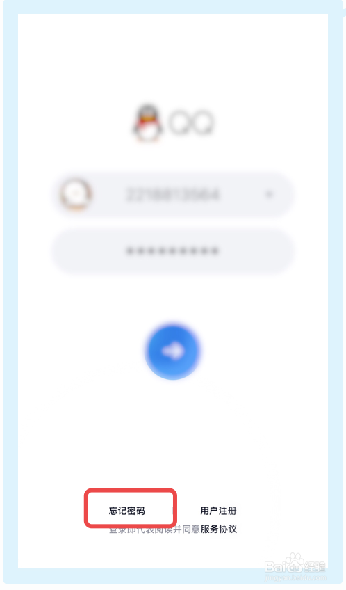 1.打开QQ,在QQ登录页,选择并点击【健忘密码】;