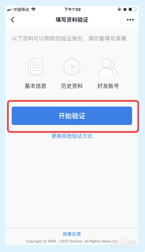 在【填写资料进行验证】界面,选择并点击【起头验证】选项。