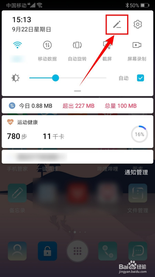 通知栏上方位置是手机系统方面的快捷开关,我们可以按照本身的利用频率更改这些开关的排序。点击右上角如下图中的铅笔按钮。
