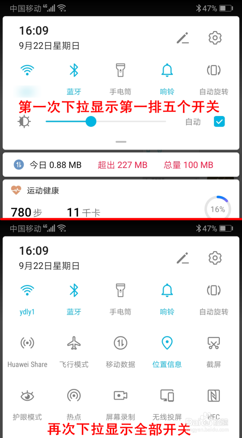因为华为手机第一次下拉通知栏只显示第一排的五个开关,需要再次下拉才能显示全数开关,是以在排序时最好将最常用的五个放在第一排。