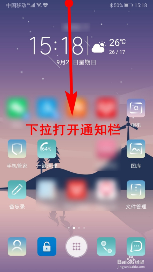 手指从屏幕上部边缘往下拉,打开下拉通知栏。