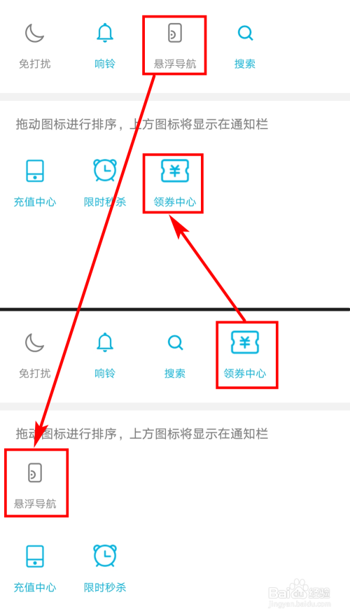 我们还可以将本身不消的按钮,拖动到下面的位置,下面的开关将不会显示在通知栏中,从而使通知栏显得加倍简练。好比我把上面的“悬浮导航”移到下面,把下面的“领券中间”移到上面,如下图所示: