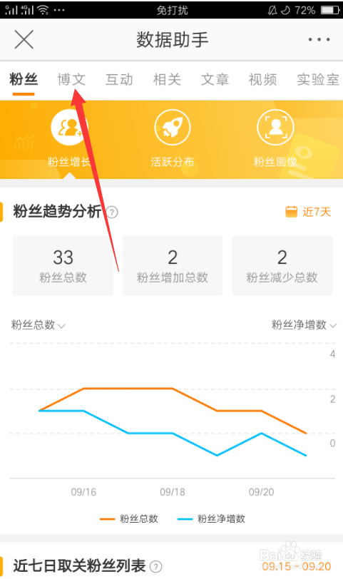点击后,在弹出的粉丝办事界面点击粉丝趋向选项,如图。