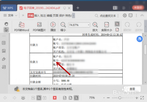 打开电子回单,在【收条目方账户】可查看完整银行卡。