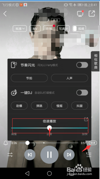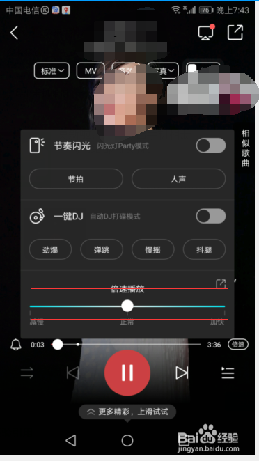 点击倍速,就显示倍速的播放的条,拖动中心的原点标的目的左,即可调整歌曲播放的变慢。