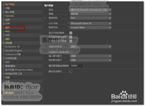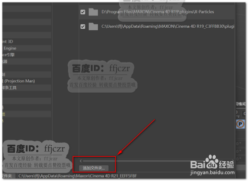 打开编纂中的设置选项(Ctrl+e),在面板中找到插件选项(这是R21才有的)点开,点击对话框下方的添加文件夹。