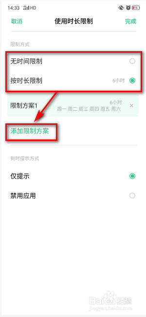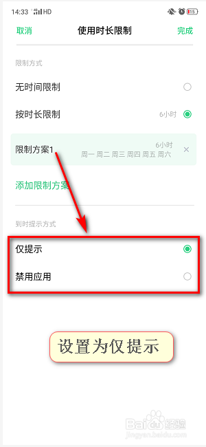 添加好限制方案时,设置到时提醒体例:仅提醒或者禁止应用。这里建议利用仅提醒;