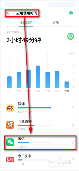 进入微信利用时候页面后,查看当天的微信利用频率及利用岑岭期;