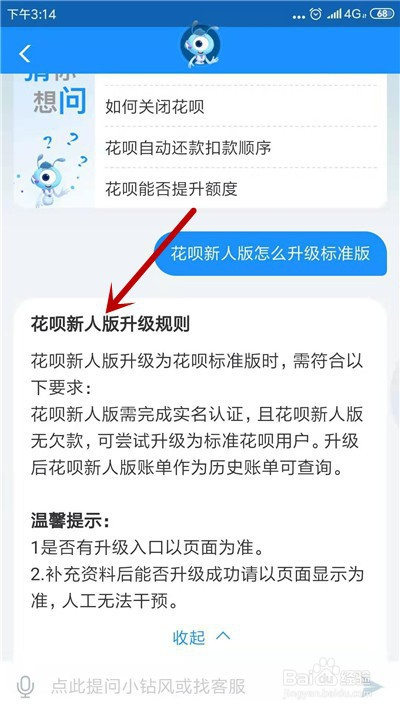 支付宝的花呗一向都受到大师的喜爱,但因为违规原因会导致花呗变为新人版,此时大师必定火急的想要进级到尺度版,那怎么进级呢?在帮忙中查到,必需要完美资料和结清花呗的欠条目,然后期待主动进级,下面给大师具体的介绍一下。