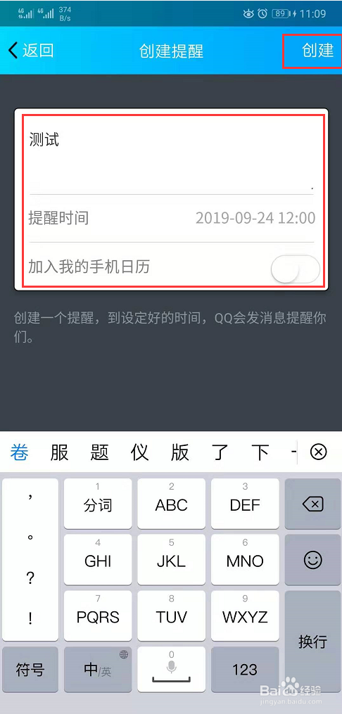 在建立提醒页面,输入【提醒内容】【提醒时候】,就可以点击右上角的【建立】按钮,这样就可以利用手机QQ给本身按时发送动静了