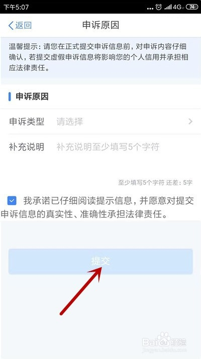 第六步,选择申诉类型及申明,点击“提交”即可。