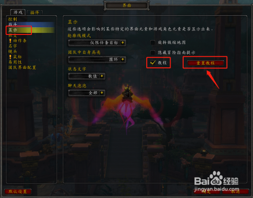 4、点击“显示”,勾选教程并点击重置教程;