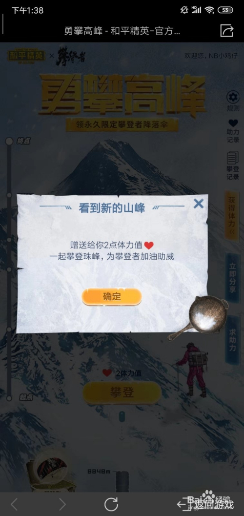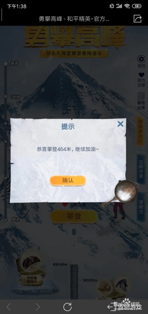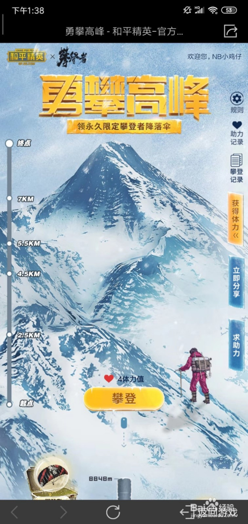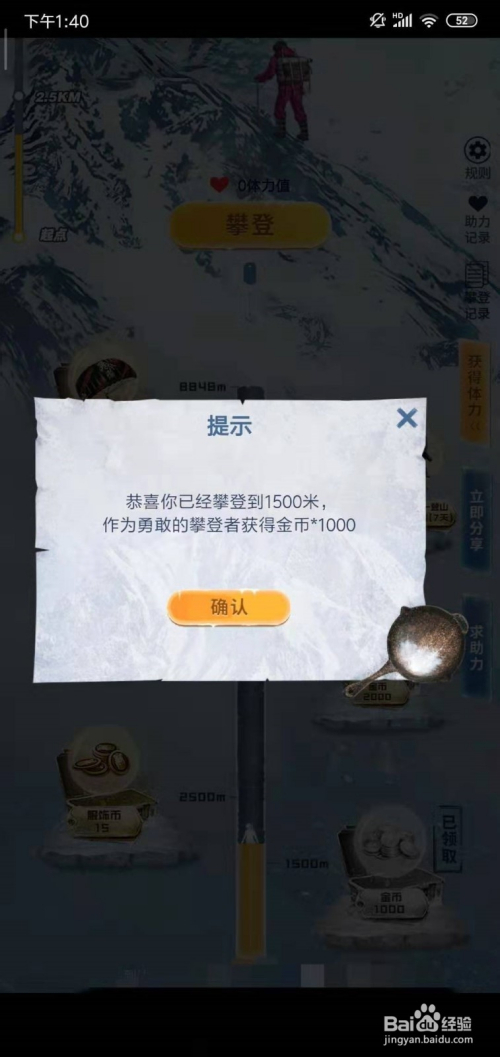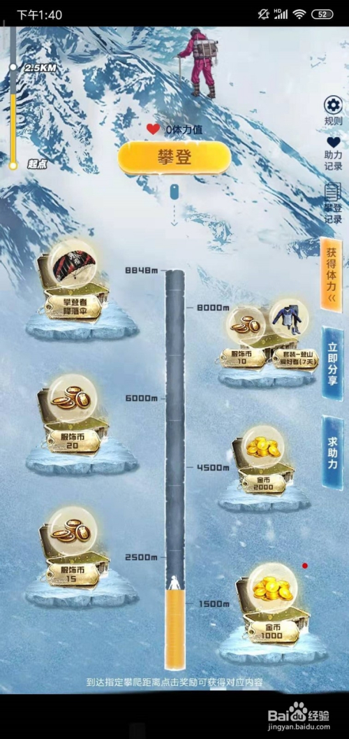 好比我们达到了1500M高度,就能领取1000金币,达到8000M可以获得爬山快乐喜爱者套装,登岸8848M就可以获得攀缘者下降伞。