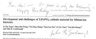 黄云辉:仿佛没啥业余快乐喜爱,本家儿要就是工作,总喜好想些科学问题,出格是对新系统感乐趣,但根基上想出来的都有人家报道过,100 个新的设法中估量也就有一两个当作功的,但也就是这一两个当作功的才有了钴酸锂和磷酸铁锂。他本身写过自传《Witness to Grace》,回国时送过我一本签名的,后来我去看他时又送过一本他签名的,估量是忘了以前送过。总记得 2016 年我过 50 岁生日的时辰,师长教师给我写的一句话,“50 years is only the beginning”,50 岁才只是个起头 (笑),真的给我很大的激励。